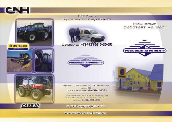 Компания «Россошь-АгроПол-Р» является официальным дистрибьютором компании New Holland в России и осуществляет продажу техники, оригинальных запасных частей, а так же производит техническое обслуживание и ремонт всего модельного ряда CASE и New Holland.